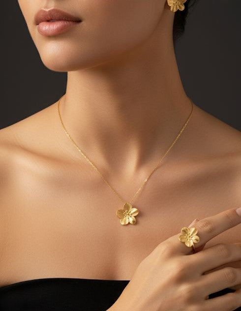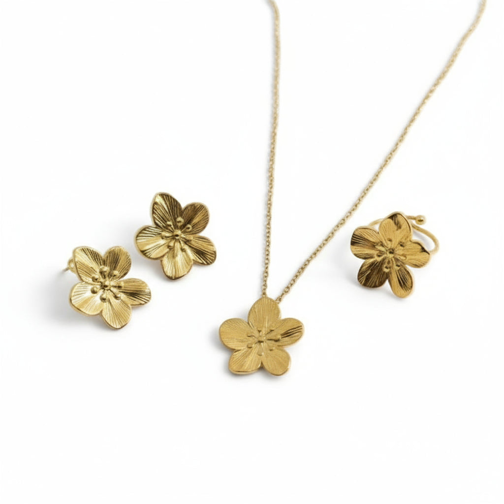 Éclat – La parure Fleur Épanouie révèle toute la beauté et la grâce des fleurs en pleine floraison. Composée d’un collier à motif fleur à 5 feuilles, de boucles d’oreilles assorties et d’une bague ajustable, elle allie féminité, élégance et intemporalité. Chaque détail floral finement travaillé sublime votre style, que ce soit pour le quotidien ou pour une occasion spéciale.
